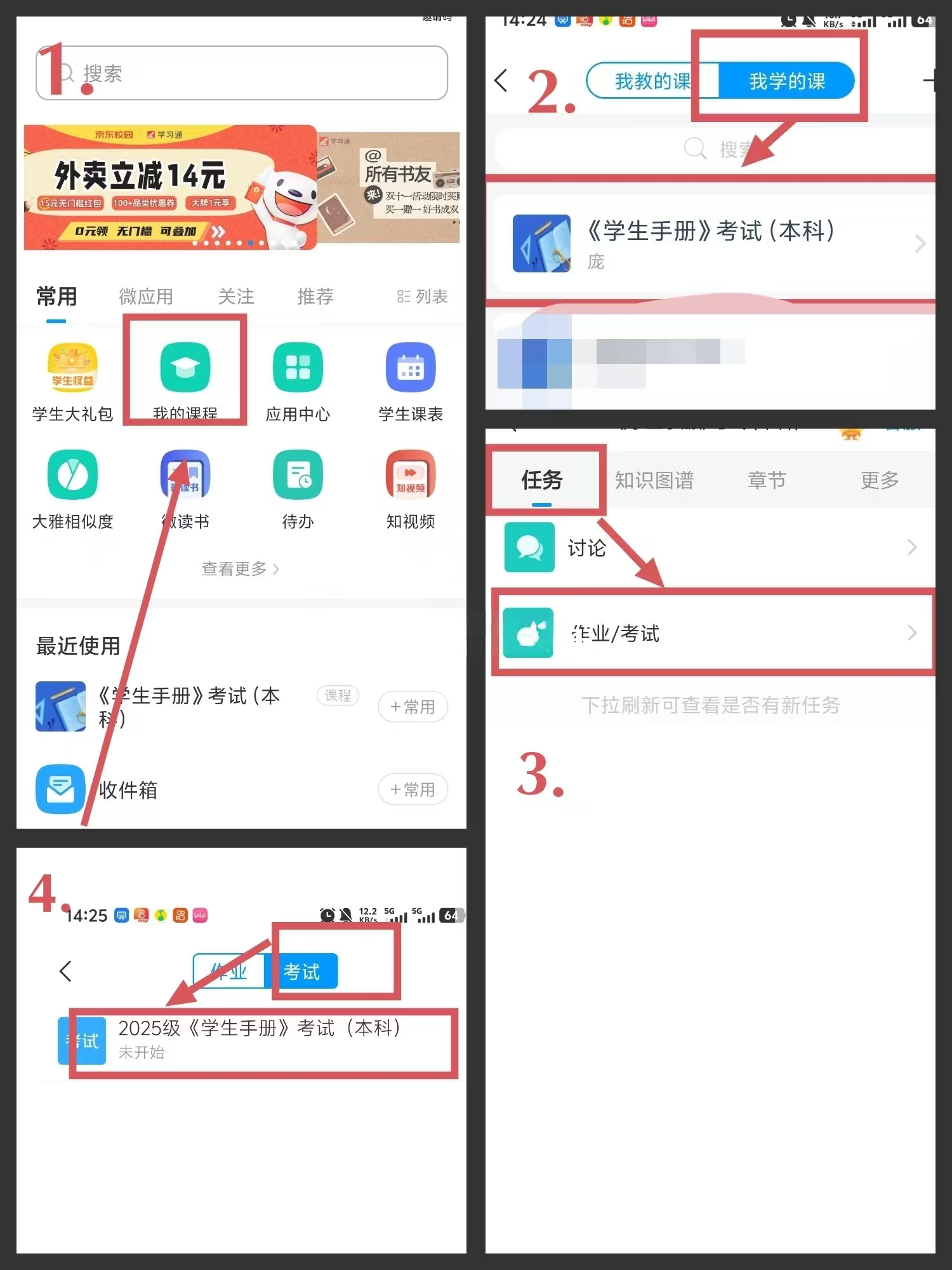 本次学生手册考试将通过“学习通”APP中“我的课程”板块进行考试。具体操作见以下流程: